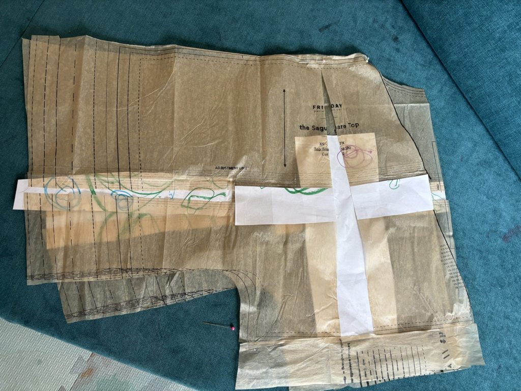 I started cutting out the pattern, and Friday Pattern Co’s website had a full bust adjustment instruction and wrap crossover adjustment instructions, so it turns out I wasn’t getting too far ahead of myself with my plans. The only free wheeling was adding 2 inches to the body as shown below, and I decided to use 1.25″ elastic instead of 2″ elastic recommended on the instructions. 4″ total of elastic on my midsection sounds horrible.
